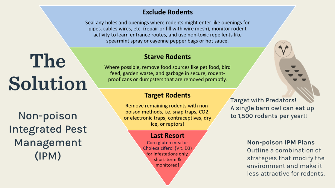 There are many ways to control rodents other than with the use of SGARs. The most popular system is via Integrated Pest Management (IPM) which promotes a variety of methods starting with excluding the rodents, and removing their food source.