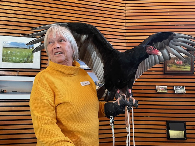 Linda Noon from Tailwinds Raptor Education & Conservation with Greta, the turkey vulture.