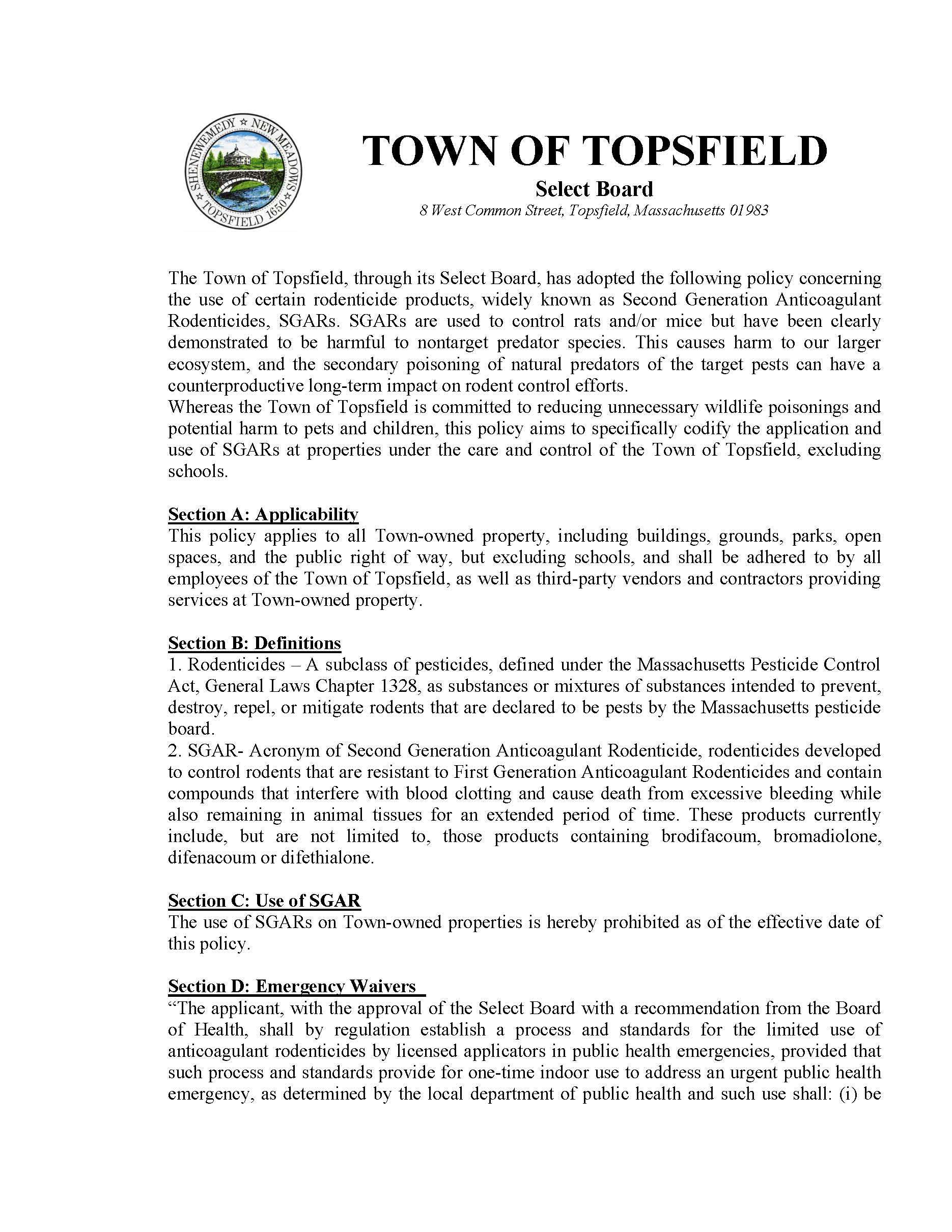 The Town of Topsfield has officially adopted a policy to ban SGAR use on municipal properties!